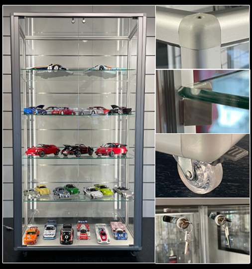 Grande Vitrine pour miniatures 1/18, 1/12 Jusqu'à 30 miniatures à l'échelle 1/12 - 2 portes vitrées avec serrures 4 étagères / 5 niveaux de présentation - En Aluminium et Verre - Avec éclairage LED Plancher en panneau de bois - 4 roulettes avec systeme de frein Dimensions 184,5 x 99 x 55 cm - Fabriqué en Allemagne 1449,95 € TTC / Incl. Taxes