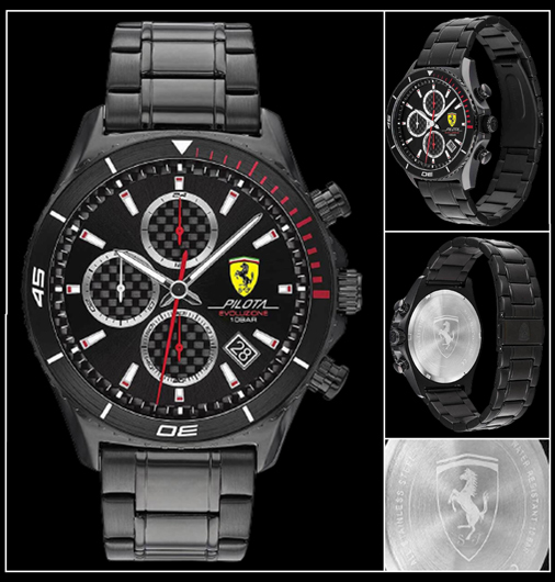 Montre Ferrari Pilota Evo Mouvement quartz - Fonction départ-arrêt avec mesure intermédiaire et tachymètre Trois fenêtres style compteur de vitesse - Fond couleur Noir Verre antireflets - Bracelet acier inoxydable - Fermoir par boucle déployante Boîtier étanche 10 ATM - Diamètre 44 mm - Garantie 2 ans Ferrari FE0830756 299,95 € TTC / Incl. Taxes