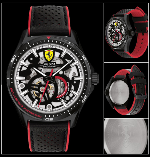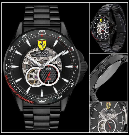 Montre Automatique Ferrari Pilota Cadran squelette apparent à plusieurs niveaux - Bracelet en acier inoxydable noir Mouvement Automatique Miyota Japan - Boucle déployable en acier inoxydable - Verre plat Couleur : Noir / Argent - Fenêtre avec les secondes / Aiguille rouge style compteur de vitesse Boîtier étanche 5 ATM - Diamètre 42 mm - Epaisseur 12 mm - Garantie 2 ans Ferrari FE0830602 499,95 € TTC / Incl. Taxes