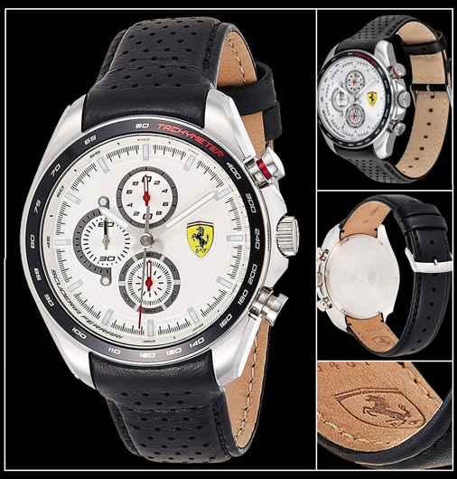 Montre Ferrari Speedracer Mouvement quartz - Fonction départ-arrêt avec mesure intermédiaire et tachymètre Trois fenêtres style compteur de vitesse - Fond couleur Blanc Verre antireflets saphir - Bracelet en cuir - Boucle déployable en acier inoxydable Boîtier étanche 5 ATM - Diamètre 47 mm - Garantie 2 ans Ferrari FE0830651 229,95 € TTC / Incl. Taxes