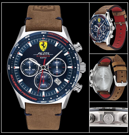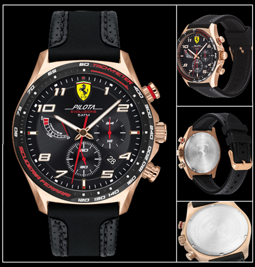 Montre Ferrari Pilota Evo Mouvement quartz - Fonction départ-arrêt avec mesure intermédiaire et tachymètre Trois fenêtres style compteur de vitesse - Fond couleur Noir Verre antireflets - Bracelet en cuir - Fermoir par ardillon Boîtier étanche 5 ATM - Diamètre 44 mm - Garantie 2 ans Ferrari FE0830710 229,95 € TTC / Incl. Taxes