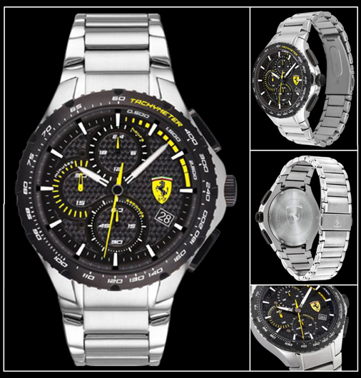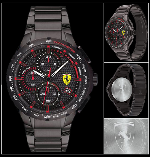 Montre Ferrari Pista Mouvement quartz - Fonction départ-arrêt avec mesure intermédiaire et tachymètre Trois fenêtres style compteur de vitesse - Cadran couleur noir texturé en fibre de carbone Verre antireflets - Bracelet acier inoxydable - Fermoir par clip Boîtier étanche 5 ATM - Diamètre 44 mm - Garantie 2 ans Ferrari FE0830730 349,95 € TTC / Incl. Taxes