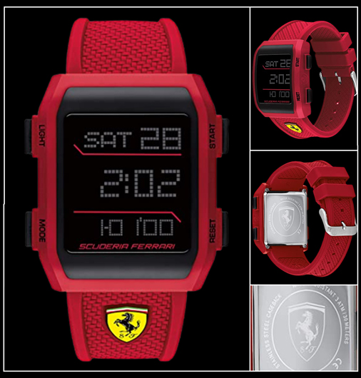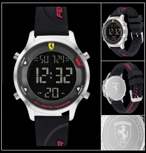 Montre Digitale Scuderia Ferrari Mouvement quartz - Affichage digital - Cadran noir - Couleur : noir / rouge Verre antireflets - Bracelet en silicone - Fermoir réglable par boucle Boîtier étanche 3 ATM - Diamètre 40 mm - Garantie 2 ans Ferrari FE0830756 89,95 € TTC / Incl. Taxes