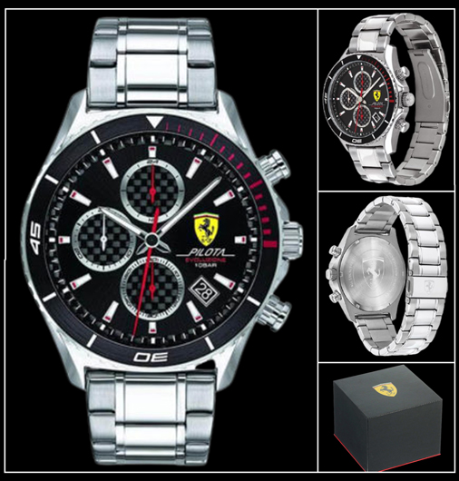 Montre Ferrari Pilota Evo Mouvement quartz - Fonction départ-arrêt avec mesure intermédiaire et tachymètre Trois fenêtres style compteur de vitesse - Fond couleur Noir Verre antireflets - Bracelet acier inoxydable - Fermoir par boucle déployante Boîtier étanche 10 ATM - Diamètre 44 mm - Garantie 2 ans Ferrari FE0830772 299,95 € TTC / Incl. Taxes