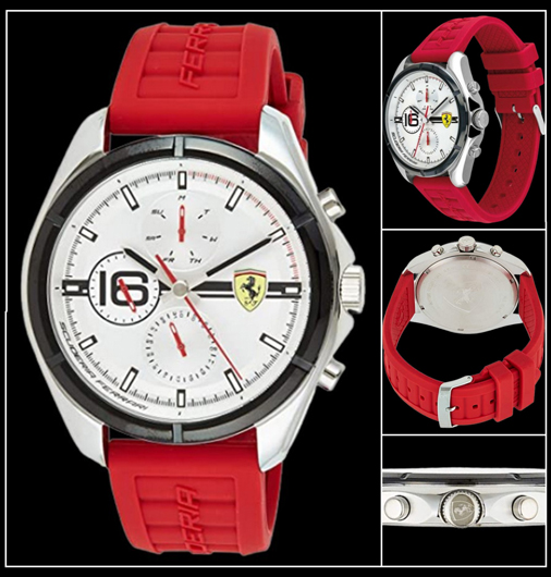 Montre Ferrari Scuderia Mouvement quartz - Fonction départ-arrêt avec mesure intermédiaire et tachymètre Trois fenêtres style compteur de vitesse - Fond couleur Blanc Verre antireflets saphir - Bracelet silicone rouge - Fermoir réglable par boucle Boîtier étanche 5 ATM - Diamètre 44 mm - Garantie 2 ans Ferrari FE0830783 179,95 € TTC / Incl. Taxes