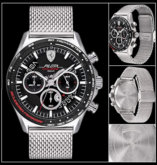 Montre Ferrari Pilota Evo Mouvement quartz - Fonction départ-arrêt avec mesure intermédiaire et tachymètre Trois fenêtres style compteur de vitesse - Fond couleur Noir Verre antireflets - Bracelet en maille acier inoxydable - Fermoir déployant Boîtier étanche 5 ATM - Diamètre 44 mm - Garantie 2 ans Ferrari FE0830826 229,95 € TTC / Incl. Taxes