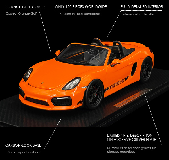 Porsche Boxster Spyder "Nemo" 2016 Orange Gulf 1/18 - Spark 18RSF006 Edition limitée - 150 exemplaires numérotés 279,95 € TTC / Incl. Taxes