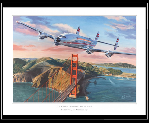 Reproduction d'une peinture originale de Benjamin Freudenthal Lockheed Constellation San Francisco 80 x 60 cm - Papier 300 g/m2 verni anti-UV Série limitée 350 exemplaires numérotés et signés 39,95 € TTC / Incl. Taxes
