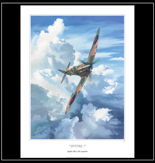 Reproduction d'une peinture originale de Benjamin Freudenthal Spitefire MK I, 602 Squadron 80 x 60 cm - Papier 300 g/m2 verni anti-UV Série limitée 350 exemplaires numérotés et signés 44,95 € TTC / Incl. Taxes