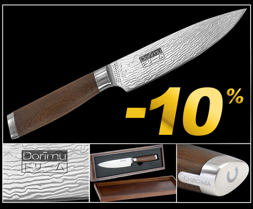 Couteau de Cuisine Japonais Dorimu Pure Damas Pure Damas 64 couches VG10/VG2 / Fabrication entièrement artisanale - Longueur 23 cm Aiguisage ambidextre en V aigu pour un tranchant immédiat - Poids 86 g Manche ergonomique en érable norvégien très dur Chroma D-01