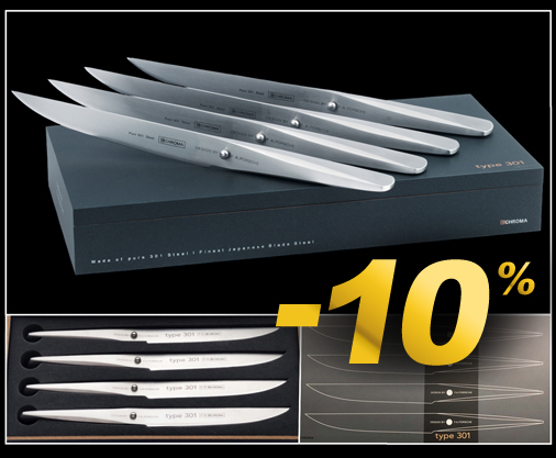 Coffret 4 Couteaux à Steak - Porsche Design Type 301 Acier japonais 0.7% de carbone + molybdène vanadium - Longueur 24,1 cm Acier japonais 0.7% de carbone + molybdène vanadium - Manche ergonomique en inox Aiguisage ambidextre - Design exclusif issu du Studio F. A. Porsche Chroma P16 - Garantie 5 ans