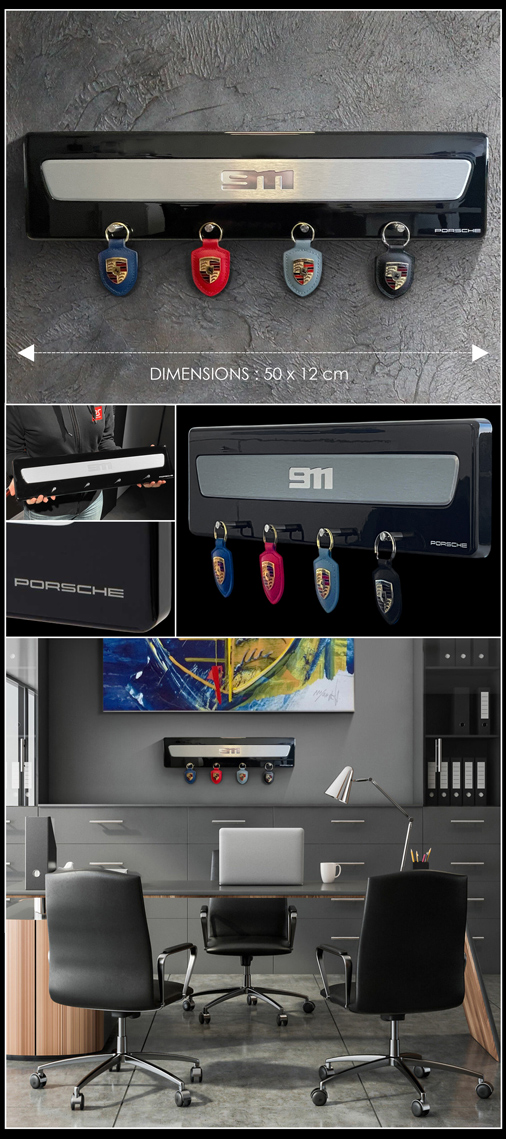 Grand Porte-clés Mural Porsche 911 Composé d'une authentique plaque de seuil de portière 911 - Dimensions 50 x 12 x 2 cm Couleur Noir laqué / Gris argent - Fabriqué en Allemagne - Porte-clés non inclus Comprend 2 vis à têtes bombées 4 x 35 mm. et 2 chevilles fischer SX Plus 6 Porsche WAP0506010TSBR 279,95 € TTC / Incl. Taxes