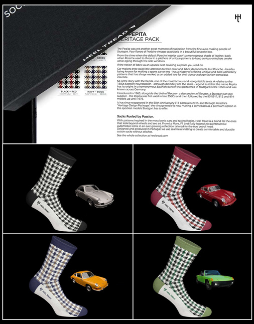 Set de 4 Paires de chaussettes mixtes - Inspiration Porsche 911 Pepita 356 pied de poule rouge - 911 pied de poule noir 912 pied de poule beige - 914 pied de poule vert Matière 80% Coton peigné / 17% Polyamide / 3% Elasthanne Tricoté en continu sans coutures - Lavable 40°C maxi 49,95 € TTC / Incl. Taxes