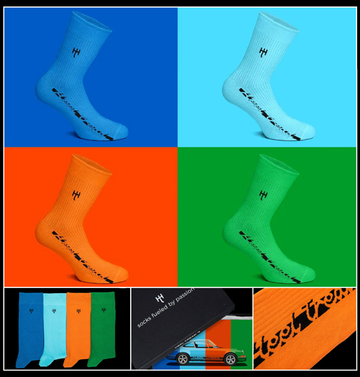 Set de 4 Paires de chaussettes mixtes - Inspiration Porsche 911 Carrera RS 2.7 Bleu Glacier - Bleu Gulf - Orange Tangerine - Vert Vipère Matière 80% Coton peigné / 17% Polyamide / 3% Elasthanne Tricoté en continu sans coutures - Lavable 40°C maxi 44,95 € TTC / Incl. Taxes