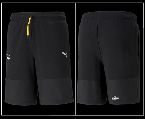 Short homme Porsche Turbo by Puma - Tailles XS / M Seulement Taille élastique et détail cordon de serrage jaune - 2 poches latérales Couleur : Noir - Matière : 68% coton / 32% polyester Puma 533776-01