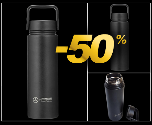 Gourde Mercedes-AMG F1 Matière 100% Acier inoxydable - Contenance 720 ml - Couleur Noir Couvercle dévissable - Poignée de transport Mercedes 701227057-001