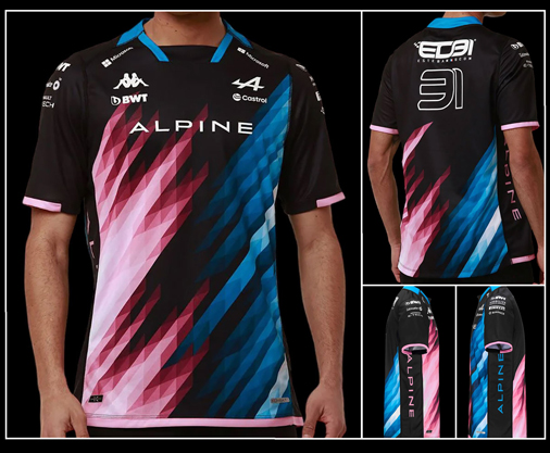 T-shirt homme Esteban Ocon Alpine F1 2024 Couleur Noir / Bleu / Rose - Matière 100% Polyester Kappa 321R78W-A01 74,95 € TTC / Incl. Taxes