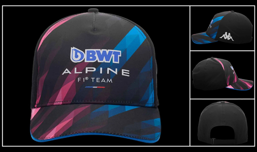 Casquette Alpine F1 2024 Matière 90% Nylon / 10% Elasthanne - Couleur Noir / Bleu / Rose - Taille réglable Kappa 381R8BW-A01 29,95 € TTC / Incl. Taxes