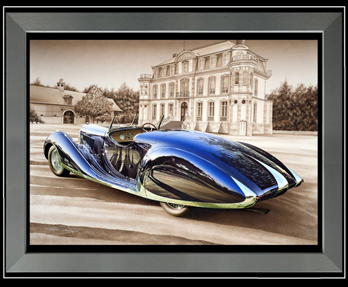 Poster Encadré Bugatti Type 57 Reproduction d'une peinture originale de François Bruère 50 x 65 cm - Cadre aluminium brossé gris plomb Limitée à 300 exemplaires numérotés et signés 179,95 € TTC / Incl. Taxes
