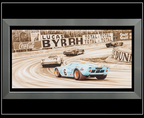 Poster Encadré Ford GT40 Le Mans 1969 Reproduction d'une peinture originale de François Bruère 40 x 60 cm - Cadre aluminium brossé gris plomb Limitée à 300 exemplaires numérotés et signés 99,95 € TTC / Incl. Taxes