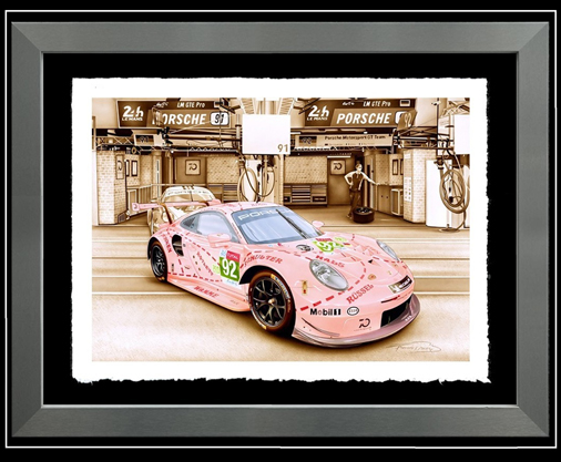 Poster Encadré Porsche 911 RSR Le Mans 2018 Reproduction d'une peinture originale de François Bruère 50 x 65 cm - Cadre aluminium brossé gris plomb Limitée à 300 exemplaires numérotés et signés 169,95 € TTC / Incl. Taxes