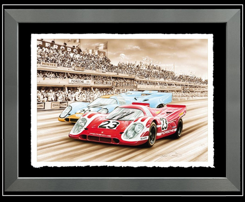 Poster Encadré Porsche 917 Le Mans 1970 Reproduction d'une peinture originale de François Bruère 50 x 65 cm - Cadre aluminium brossé gris plomb Limitée à 300 exemplaires numérotés et signés 169,95 € TTC / Incl. Taxes