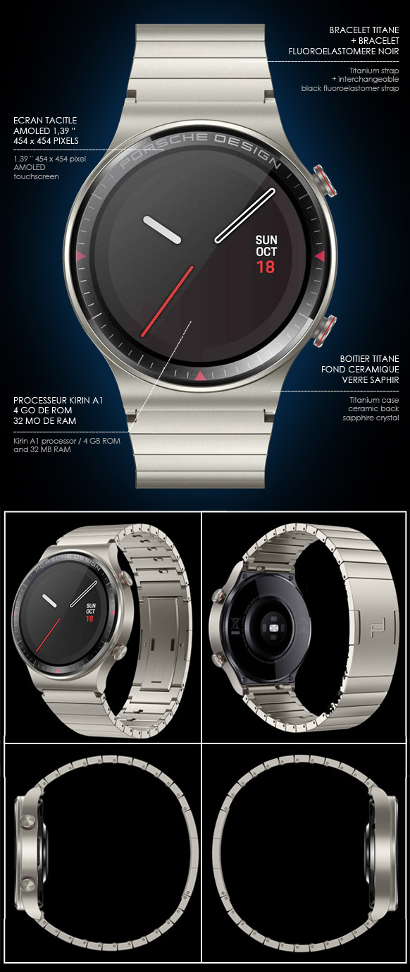 Montre Connectée Porsche Huawei GT 2 Titane Boitier en titane avec fond céramique et verre saphir - Écran tactile AMOLED 454 x 454 pixels Bracelet titane + bracelet fluoroélastomère - Connectivité Bluetooth 5.1 / BLE / BR / EDR Batterie 455 mAh / autonomie jusqu'à 14 jours - Recharge sans fil en moins de 2 heures Fonctions : Téléphone, Géolocalisation, Sports Trainer, Musique, Capteur cardiaque Processeur Kirin A1 / ROM 4 Go / RAM 32 Mo - Os Android 4.4 / iOS 9.0 ou supérieur Dimensions 46,7 × 46,7 × 11,4 mm - Poids env. 52 g (sans bracelet) Certifié étanche 5 ATM - Porsche Design 4056487008066 699,95 € TTC / Incl. Taxes
