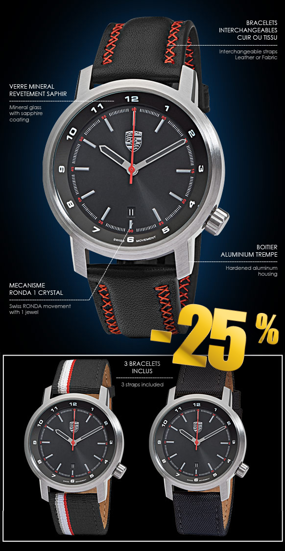 Montre Chronographe Porsche - Essential 911 Silver Edition Mouvement Suisse Ronda 1 cristal - Bracelet cuir noir, surpiqûres rouges Deux bracelets tissu avec mécanisme de remplacement rapide inclus Boucle ardillon acier inoxydable - Verre minéral avec revêtement saphir Etanche jusqu'à 10 ATM / 100 m - Diamètre 43 mm - Garantie 2 ans Porsche WAP0700010J