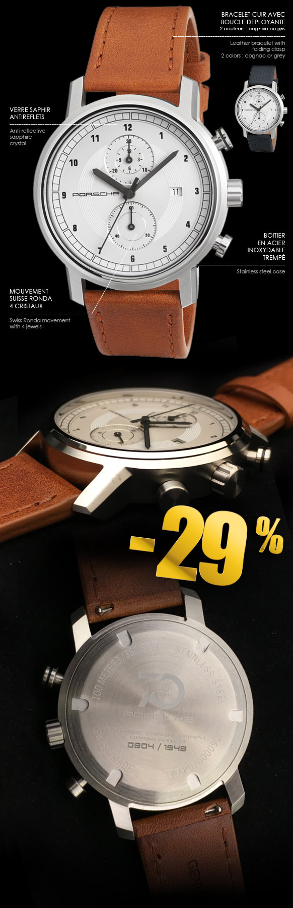 Montre Chronographe Porsche Classic - Edition limitée 70 ans Porsche Boîtier étanche et finition satinée en acier inoxydable trempé Mouvement suisse Ronda avec 4 cristaux Bracelet en cuir interchangeable avec boucle déployante Verre cristal saphir anti-reflets - Etanche 10 ATM - Diamètre : 44 mm Fabriqué en Suisse - Garantie 2 ans Série limitée à 1948 exemplaires numérotés Porsche Design WAP07000090K