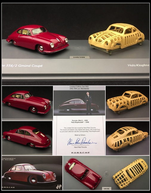Set Porsche 356 - Collection Hans-Peter Porsche 356 Gmünd n° 45/52 1950 - Gabarit de frappe pour la carrosserie 1948 Rouge 1/43 - Schuco 7563 Edition limitée - 356 exemplaires numérotés Coffret luxueux avec fiche de présentation et certificat d'authenticité signé à la main 199,95 € TTC / Incl. Taxes