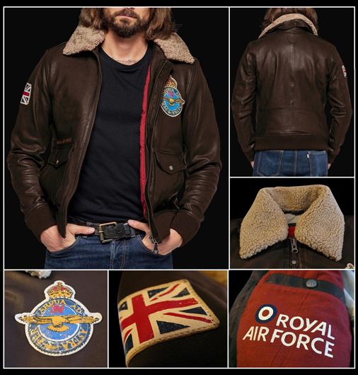Veste cuir pour homme Royal Air Force Look vintage Flight Jacket avec badges brodés - Couleur Marron foncé Col chemise doublé imitation laine amovible - Matière 100% cuir d'agneau de qualité Doublure 100% Coton / manches polyester - Patchs officiels RAF extérieur / intérieur Licence officielle de la RAF