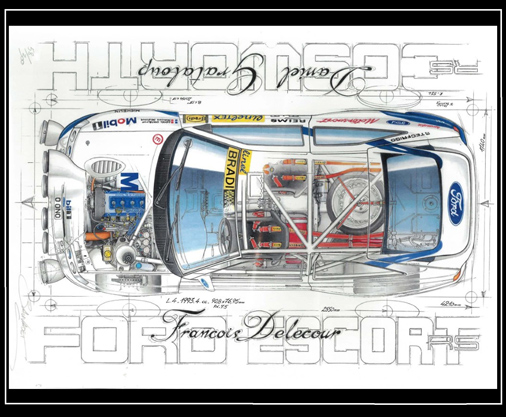 Posters Ford Escort RS Cosworth - Vainqueur Tour de Corse 1993 Reproduction de peintures originales de Sebastien Sauvadet 30 x 40 cm - Papier 250 g/m2 Edition Limitée - 300 exemplaires numérotés 39,95 € TTC / Incl. Taxes