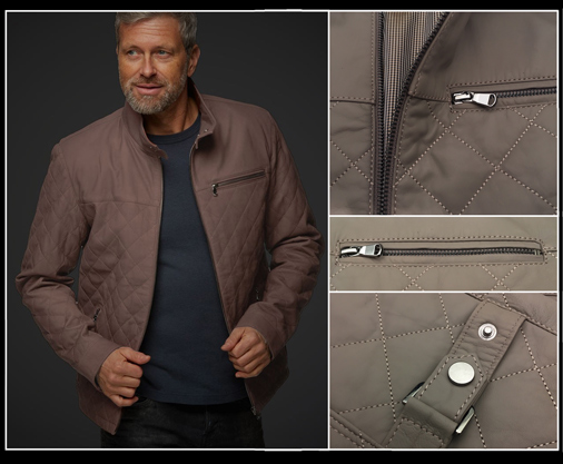Veste en cuir homme Matière 100% cuir d'agneau / doublure nylon - Couleur taupe 1 poche zippée poitrine - 2 poches extérieures - 3 poches intérieures Col et manches doublés cuir avec pressions 369 € TTC / Incl. Taxes