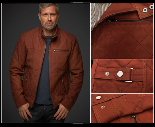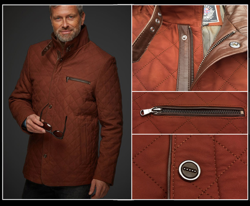 Veste en cuir homme Matière 100% cuir d'agneau / doublure nylon - Couleur cognac 1 poche zippée poitrine - 2 poches extérieures - 3 poches intérieures Col et manches doublés cuir avec pressions 369 € TTC / Incl. Taxes