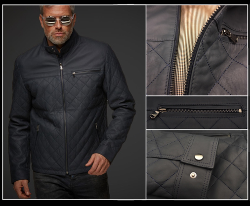 Veste en cuir homme Matière 100% cuir d'agneau / doublure nylon - Couleur ardoise 1 poche zippée poitrine - 2 poches extérieures - 3 poches intérieures Col et manches doublés cuir avec pressions 369 € TTC / Incl. Taxes