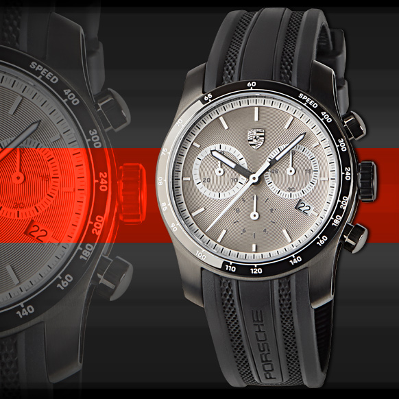 Montre Chronographe Porsche 911 type 992 Mouvement Suisse Ronda avec 13 rubis Bracelet en caoutchouc - Boîtier acier inoxydable revêtement PVD Cadran en métal avec logo Porsche - Verre saphir antireflet Boucle ardillon - Étanche jusqu'à 10 ATM - Couleur argent / bracelet noir Edition limitée - 1948 exemplaires numérotés Porsche Design WAP0709000K 699,95 € TTC / Incl. Taxes