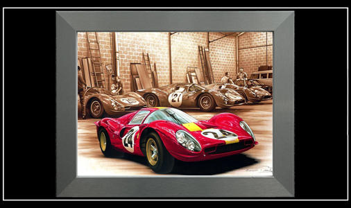 Poster Encadré Ferrari 330 Le Mans 1967 Reproduction d'une peinture originale de François Bruère 30 x 40 cm - Cadre aluminium brossé gris plomb 34,95 € TTC / Incl. Taxes