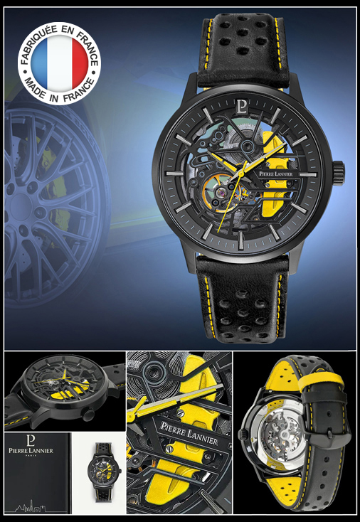 Montre automatique Pierre Lannier Paddock Fond cadran squelette - Représentation d'un étrier de frein - Bracelet en cuir Boitier en acier inoxydable noir - Verre antireflets saphir - Couleur Noir / Jaune Etanche à 50 mètres - Diamètre 43 mm - Garantie 2 ans Made in France - Pierre Lannier 338A443 279,95 € TTC / Incl. Taxes