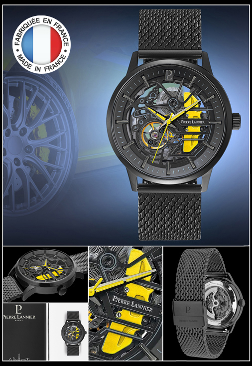 Montre automatique Pierre Lannier Paddock Fond cadran squelette - Représentation d'un étrier de frein - Bracelet en acier milanais Boitier en acier inoxydable noir - Verre antireflets saphir - Couleur Noir / Jaune Etanche à 50 mètres - Diamètre 43 mm - Garantie 2 ans Made in France - Pierre Lannier 338A449 279,95 € TTC / Incl. Taxes