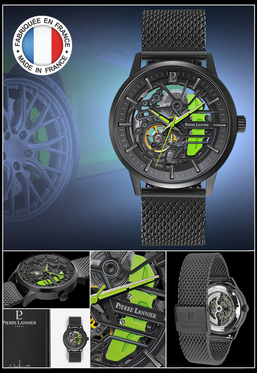 Montre automatique Pierre Lannier Paddock Fond cadran squelette - Représentation d'un étrier de frein - Bracelet en acier milanais Boitier en acier inoxydable noir - Verre antireflets saphir - Couleur Noir / Vert Etanche à 50 mètres - Diamètre 43 mm - Garantie 2 ans Made in France - Pierre Lannier 338A469 279,95 € TTC / Incl. Taxes
