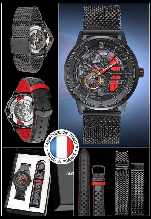 Coffret Montre automatique Pierre Lannier Paddock Fond cadran squelette - Représentation d'un étrier de frein - Boitier en acier inoxydable noir Bracelet interchangeable en cuir ou en acier milanais - Verre antireflets saphir Couleur Noir / Rouge - Etanche à 50 mètres - Diamètre 43 mm - Garantie 2 ans Made in France - Pierre Lannier 385C439 299,95 € TTC / Incl. Taxes