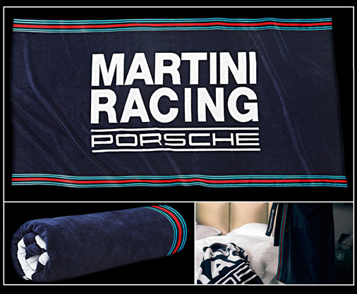 Serviette de plage Porsche Martini Racing Avec poche velcro au dos pour les objets personnels (smartphone, clés, etc.) Tissu éponge très doux - 100% Coton jacquard - Couleur bleu foncé Dimensions 190 x 90 cm - Porsche WAP5500050L0MR 79,95 € TTC / Incl. Taxes