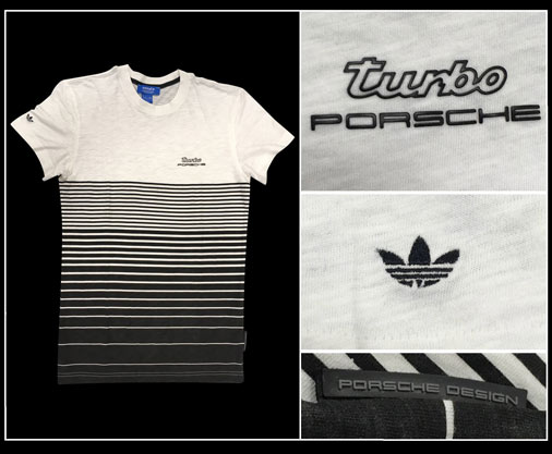 T-shirt homme Porsche Design Striped Adidas Rayures Porsche Turbo Logo Adidas brodé sur la manche Etiquette Porsche Design sur le coté Matière : 100% coton Couleur : blanc / noir