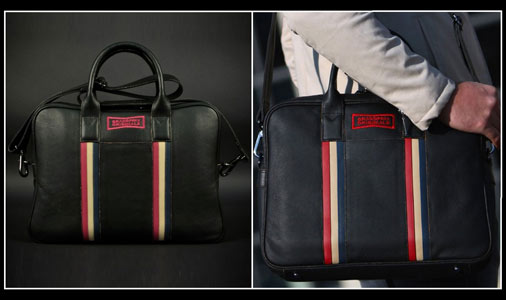 Sac Laptop cuir Gulf Logo Heuer brodé sur le sac Couleur : noir Grande poche zippée avec tirette en forme de pédale d'accélérateur perforée Trois poches intérieure (1 zippée, 1 ouverte, 1 grande à fermeture pression) Deux poches à l'extérieur Deux grandes poignées Une bandoulière réglable en cuir Pieds en acier 179 € TTC / Incl. Taxes