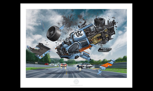 Poster Porsche 917 K n°20 Gulf - Accident Le Mans 1970 Illustration titrée de la BD Steve McQueen in Le Mans Affiche originale 250g/m2 Format 80 x 60 cm Garbo Studio 59,95 € TTC / Incl. Taxes
