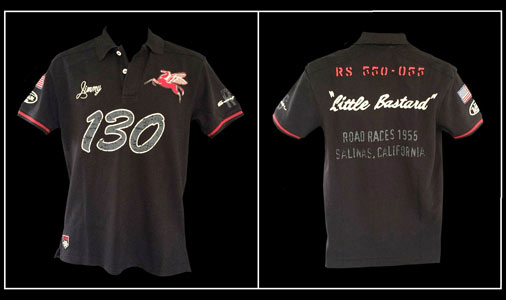 Polo homme - Porsche 550 Little Bastard n°130 Courses sur Route 1955 Salinas en Californie Logos RS Spyder, Warson Motors et le drapeau américain sur la manche Couleur: noir 100% Coton