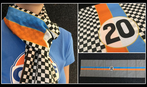 Foulard écharpe Gulf - Drapeau à damier n°20 Couleur noir et blanc / bandes orange et bleu Matière 70% coton / 30% soie Dimensions 120 x 44 cm Unisexe 59,90 € TTC / Incl. Taxes