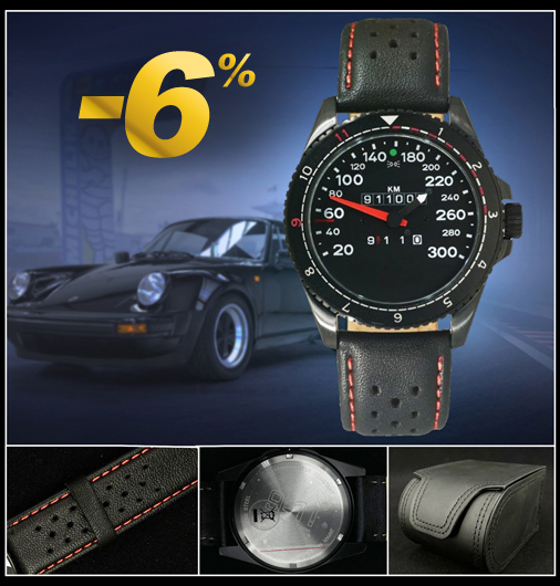 Montre compteur de vitesse Inspiration Porsche 911 Turbo 3.3 - 300 km/h Mouvement quartz Miyota Japan - Bracelet cuir noir / surpiqures rouges Boitier en acier noir - Boucle en acier - Verre plat Fond vissé - Diamètre 41 mm - Epaisseur 10 mm - Bracelet 22 mm Etanche 10 ATM / 100m - Livré dans sa boite de présentation en cuir Made in Germany