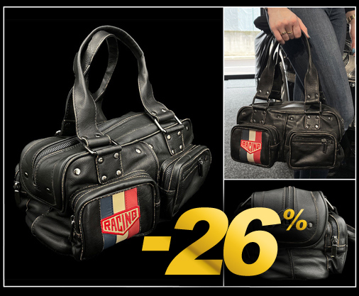 Sac à Main en Cuir Style Racing Matière 100% cuir - Doublure 100% coton - Couleur Noir 4 poches zippées à l'avant - 1 poche intérieure zippée Grand compartiment principal spacieux