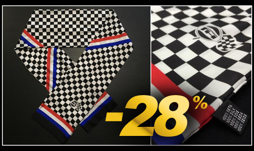 Foulard écharpe Gulf Drapeau à Damier Couleur noir et blanc / bande tricolore bleu blanc rouge Matière 100% soie - Dimensions 136 x 16 cm